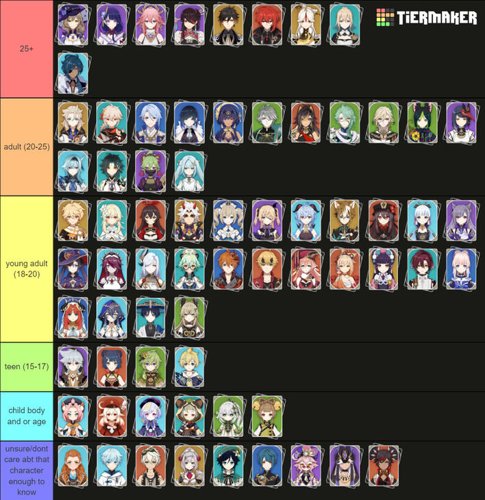 this is mostly based off of physical traits and lore bits that we know of! i know some may technically be older. adepti/other not humans (such as xiao, ganyu, yanfei, traveler etc.) are hard to categorize because they have technically lived for a while but act and look like the ages i listed them as. they do not have much of a maturity gap with the humans in genshin, so i don't worry about it too much..? i think they just age differently, the only difference is generally more knowledge about events because they lived through them.